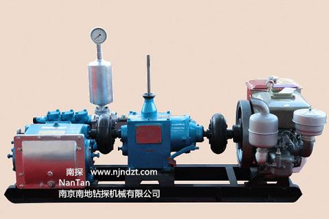 主要特點:1.具有可滿足大、小口徑鉆機所需的八擋流量,流量調(diào)節(jié)范圍大,參數(shù)選擇合理??膳cXY-4巖心鉆機和XY-5型鉆機配套使用??蓾M足不同口徑、不同孔深、不同地質(zhì)巖心鉆探的需要。 2.活塞為碗形加尼龍靠背的自封式S型聚胺脂橡膠活塞,大大提高使用壽命。 3.拉桿上設(shè)有五道防塵密封圈,以防止液力端的泥漿帶入動力端和動力端潤滑油濾。經(jīng)多次生產(chǎn)試驗證明,密封可靠,性能良好。致使齒輪延長使用壽命。 4.進排水閥采用鋼球。并在閥蓋上設(shè)有減聲橡膠墊,以減少沖擊噪聲。 5.壓力表采用BY-1型抗震壓力表,壽命長。 6.結(jié)構(gòu)緊湊,造型美觀。 7.可拆性好,便于維修和搬遷。